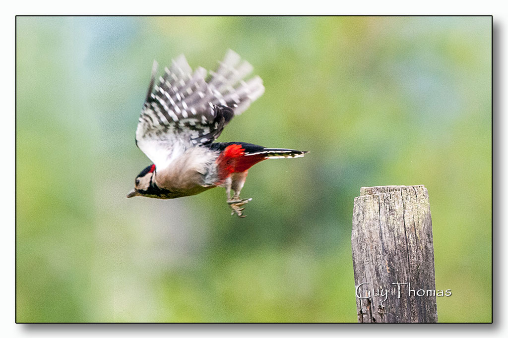 En voiture sur le retour, un pic épeiche passe devant moi et se colle à un poteau à quelques mètres