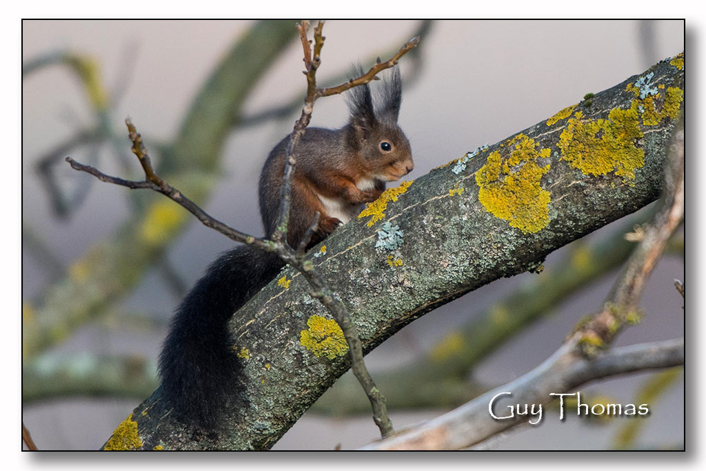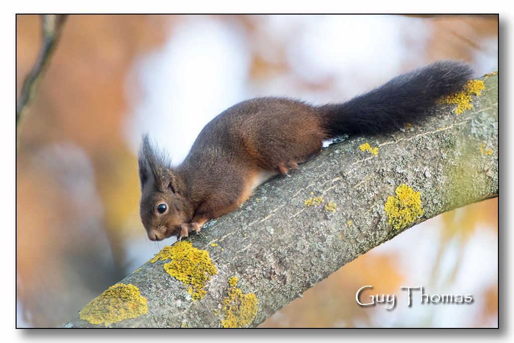 le conifère voisin, un autre écureuil saute de branche en branche, il est roux